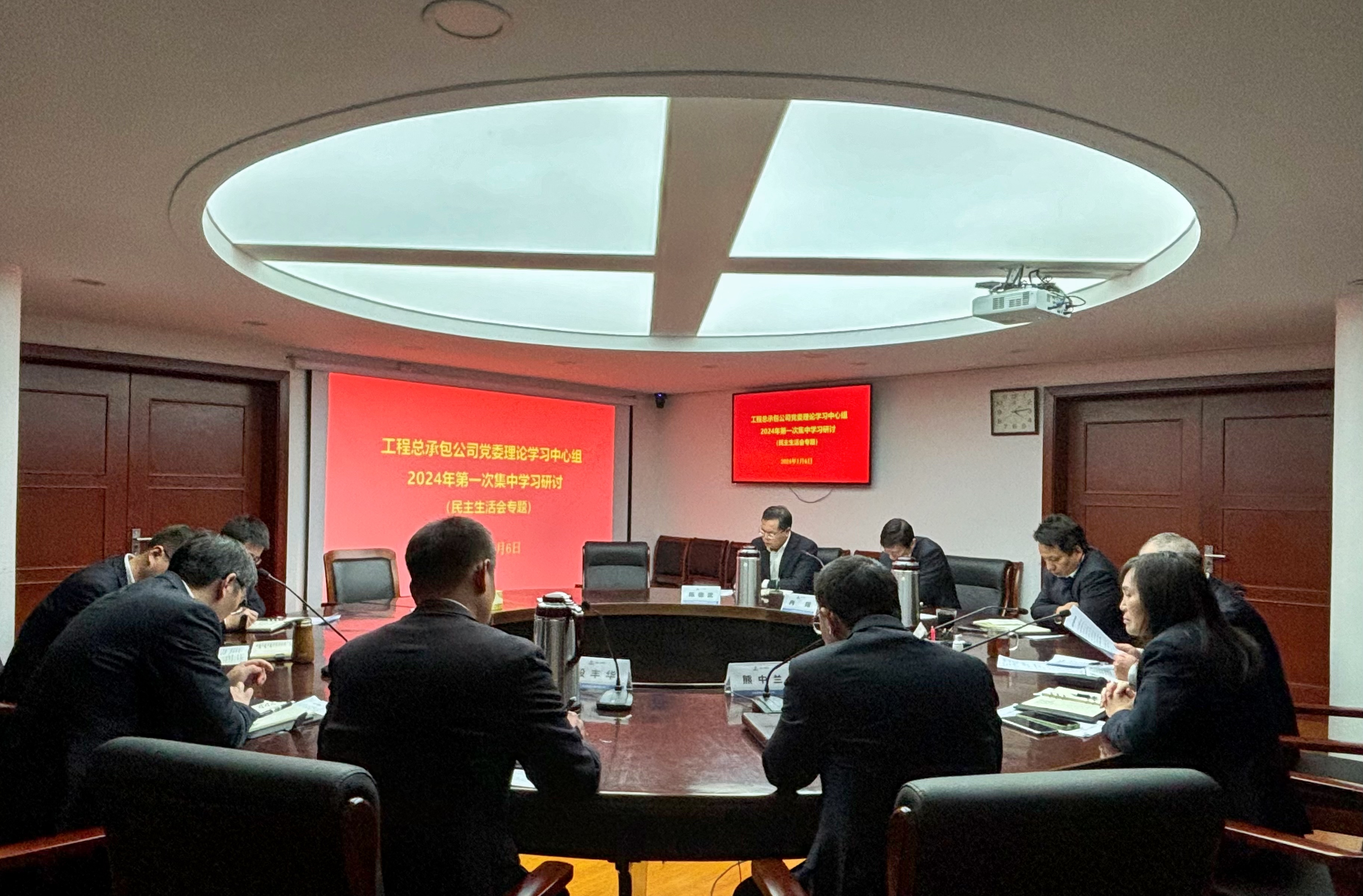 16下午工程总承包公司党委书记陈金玉主持召开党委理论学习中心组2024年第一次集中学习研讨会暨主题教育专题民主生活会集中学习研讨会,为开好2023年度民主生活会打牢思想基础,党委理论学习中心组成员参加学习。